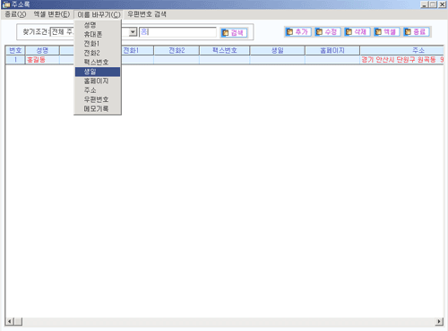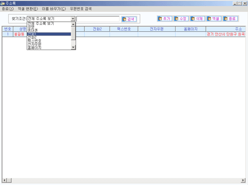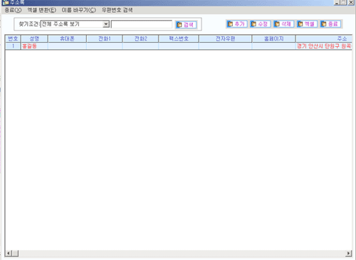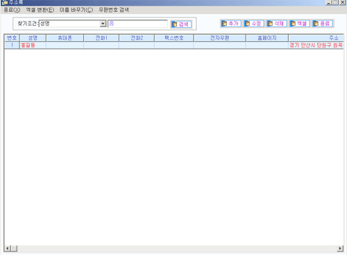 ¹× ÆÑ½º,ÀüȹøÈ£µîµîÀ» °ü¸®Çϸç Ãß°¡,»èÁ¦,¿¢¼¿·Î º¯È¯(ÁÖ¼Ò·Ï È¸é¾ç½Ä,
